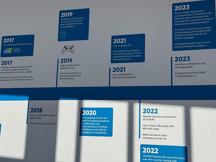 拉斯维加斯会展中心(LVCC)有一面美国消费技术协会印刷的百年纪念墙,在2022年CES的亮点里写着“OpenAI release an early demo of ChatGPT”。(OpenAI展示了一个ChatGPT的早期样品)