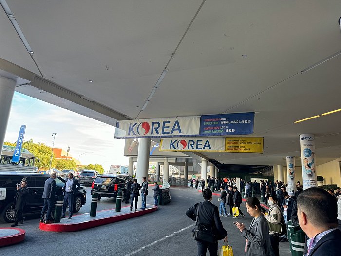 韩国甚至组团包下了威尼斯人酒店展区的多个区域,用来集中展示大量中小型韩国科技公司的创新成果,还将印有韩国名称的横幅拉满了酒店的一个出入口区域。展馆里也能看到各种举着牌子引导参观的韩国政府和民间组织代表团。