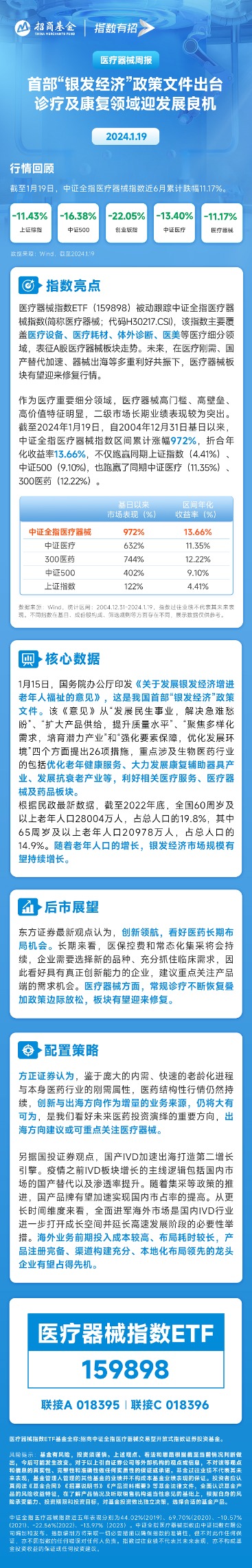 1月15日,《关于发展银发经济增进老年人福祉的意见》印发,这是我国首部“银发经济”政策文件。该建议重点涉及生物医药行业的包括优化老年健康服务、大力发展康复辅助器具产业、发展抗衰老产业等,利好相关医疗服务、医疗器械及药品板块。