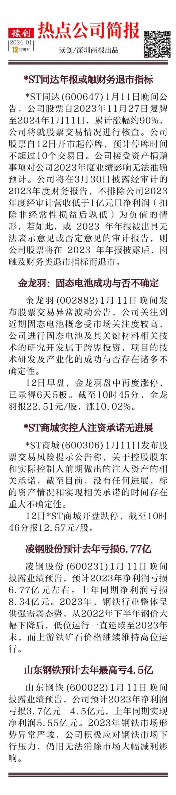 热点公司简报|ST同达:不排除2023年年报因触及财务类退市指标而退市;金龙羽称固态电池成功与否不确定仍涨停 已录得6天5板